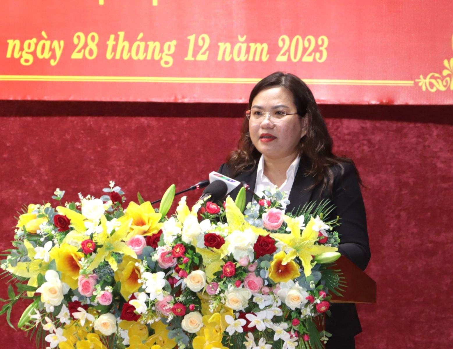 Phó Chủ nhiệm Thường trực UBKT Tỉnh ủy Lê Thị Vinh Hương báo cáo tổng kết công tác KTGS của Đảng năm 2023