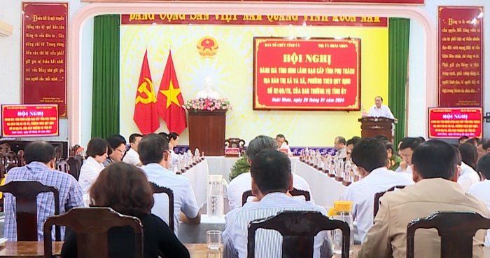Sáng ngày 20/1/2024, Ban tổ chức tỉnh ủy Bình Định phối hợp với Thị ủy Hoài Nhơn tổ chức hội nghị đánh giá tình hình, kết quả công tác theo dõi địa bàn năm 2023 của đồng chí Ủy viên Ban Thường vụ Tỉnh ủy phụ trách địa bàn thị xã Hoài Nhơn và các đồng chí lãnh đạo các cơ quan cấp tỉnh theo dõi xã, phường trên địa bàn thị xã Hoài Nhơn theo Quy định số 02 ngày ngày 29.4.2021 của Ban thường vụ tỉnh ủy. Dự hội nghị có đồng chí Nguyễn Giờ - UVBTV tỉnh ủy, Trưởng Ban tổ chức Tỉnh ủy.