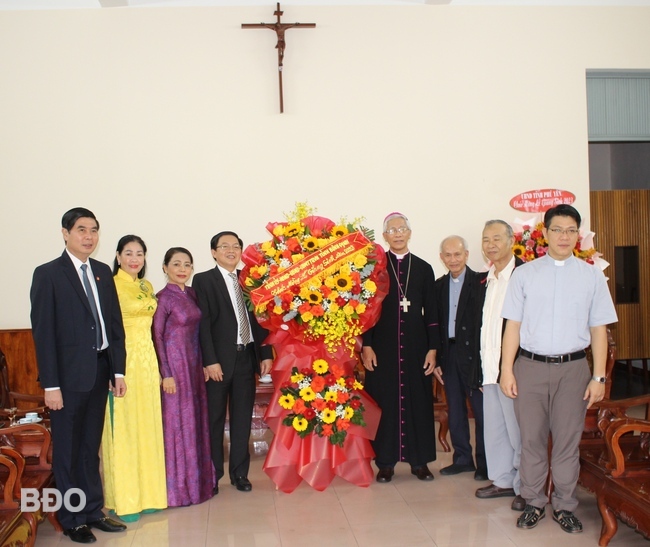Bí thư Tỉnh ủy Hồ Quốc Dũng cùng các thành viên trong Đoàn thăm, chúc mừng Giáng sinh Tòa Giám mục Giáo phận Quy Nhơn. Ảnh: N. HÂN