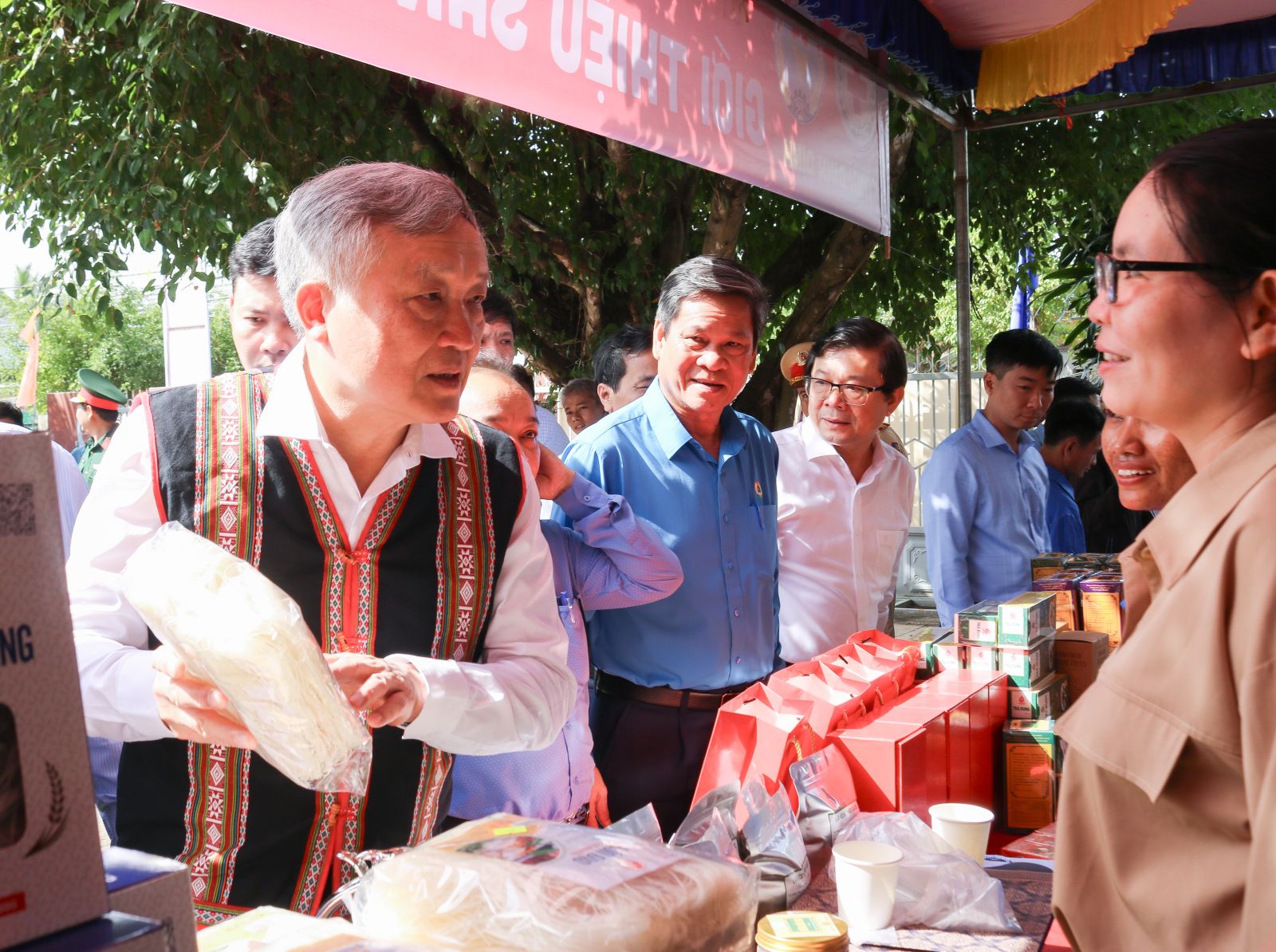 Bí thư Trung ương Đảng Nguyễn Hòa Bình và đoàn đại biểu thăm các gian hàng tại chương trình Tết Nhân ái tại huyện Vân Canh.