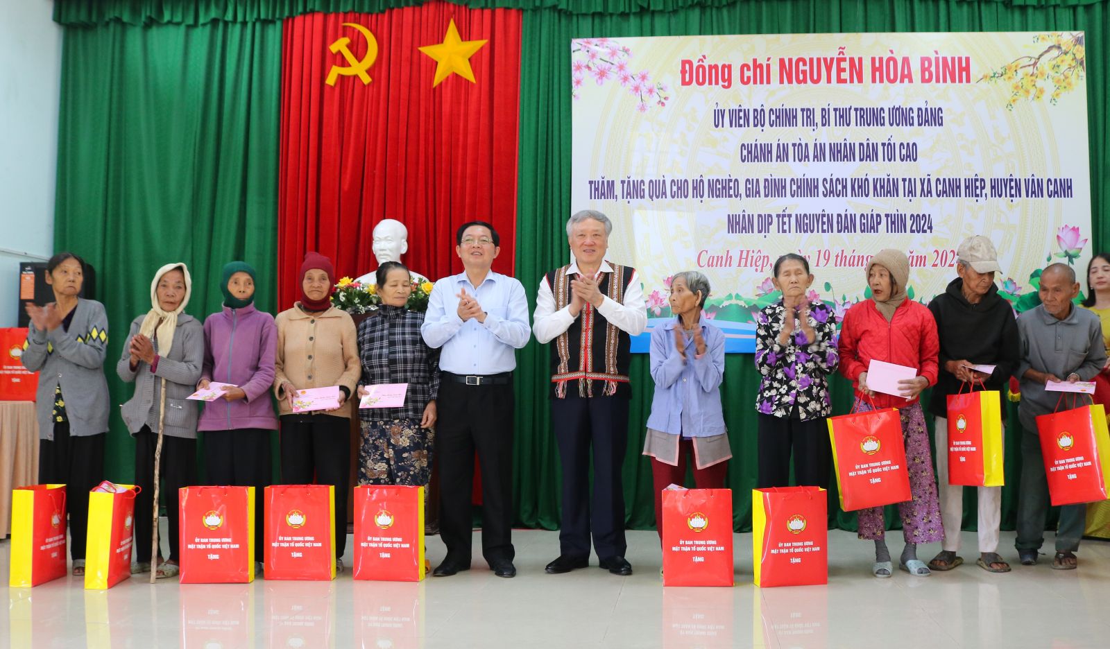 Phát biểu tại chương trình “Tết nhân ái” Xuân Giáp Thìn 2024, đồng chí Nguyễn Hòa Bình, Ủy viên Bộ Chính trị, Bí thư Trung ương Đảng, Chánh án Tòa án nhân dân tối cao, bày tỏ xúc động khi đến thăm bà con có hoàn cảnh khó khăn ở huyện Vân Canh. Đồng chí Nguyễn Hòa Bình cho biết, thời gian qua, tỉnh Bình Định đã đầu tư phát triển tốt về hạ tầng, trong đó có khu công nghiệp Becamex, huyện Vân Canh tạo ra sự tăng trưởng cho địa phương. Với sự đầu tư này, huyện Vân Canh có sự phát triển tốt hơn, giải quyết việc làm cho người dân. Đồng chí Bí thư Trung ương Đảng cũng biểu dương chính quyền địa phương các cấp của tỉnh Bình Định đã tổ chức chăm lo tốt cho người nghèo có một mùa Tết đầm ấm. Đồng thời, lưu ý trong năm 2024 và các năm tiếp theo, huyện Vân Canh cần hỗ trợ và tăng cường các giải pháp để giảm số hộ nghèo, đời sống người dân được cải thiện.
