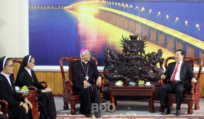 Bí thư Tỉnh ủy Hồ Quốc Dũng (phải) trò chuyện cùng đoàn đại diện Tòa Giám mục Quy Nhơn. Ảnh: M.LÂM
