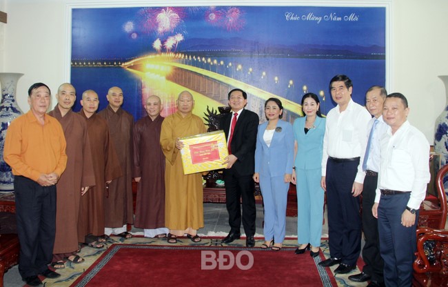 Đoàn đại diện Ban Trị sự Giáo hội Phật giáo Việt Nam tỉnh trao quà Tết cho lãnh đạo tỉnh. Ảnh: M.LÂM