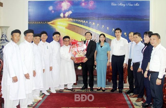 Đoàn đại diện Các hệ phái Cao Đài tỉnh Bình Định trao quà Tết lãnh đạo tỉnh. Ảnh: M.LÂM