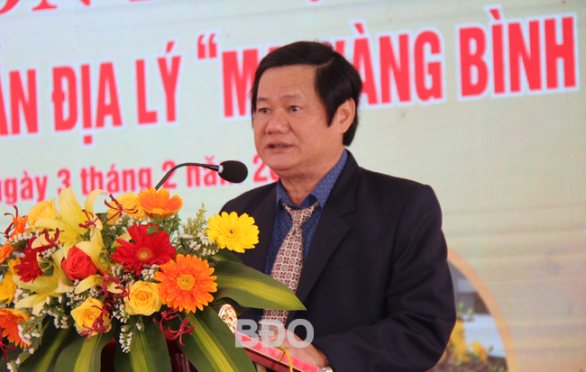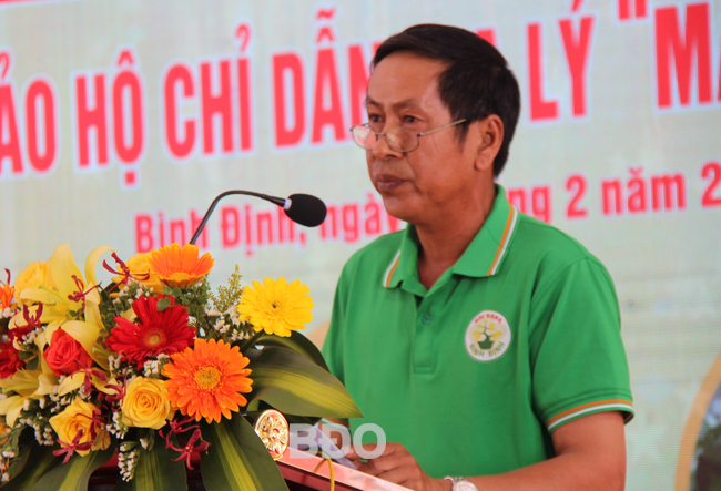 Giám đốc Sở KH&CN Lê Công Nhường phát biểu chào mừng tại lễ đón nhận văn bằng bảo hộ chỉ dẫn địa lý Mai vàng Bình Định. Ảnh: TRỌNG LỢI