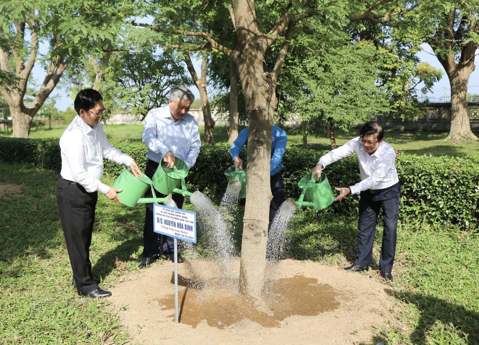 Các đồng chí lãnh đạo tưới nước cây được Bí thư Trung ương Đảng Nguyễn Hòa Bình trồng lưu niệm tại Bảo tàng Quang Trung.