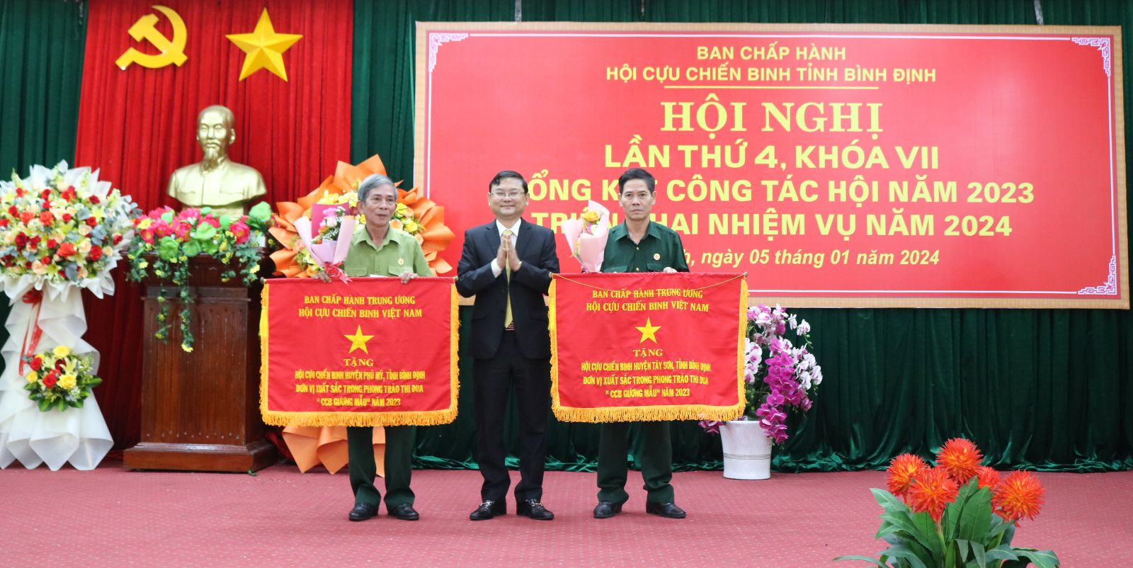 Phó Chủ tịch UBND tỉnh Nguyễn Tự Công Hoàng trao Cờ thi đua về thành tích trong phong trào thi đua “CCB gương mẫu” năm 2023 của Trung ương Hội CCB Việt Nam cho Hội CCB huyện Tây Sơn và Phù Mỹ.