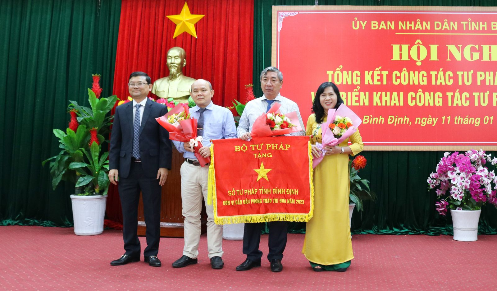 Phó Chủ tịch UBND tỉnh Nguyễn Tự Công Hoàng (trái) trao Cờ thi đua của Bộ Tư pháp cho Sở Tư pháp Bình Định, là đơn vị dẫn đầu phong trào thi đua năm 2023.