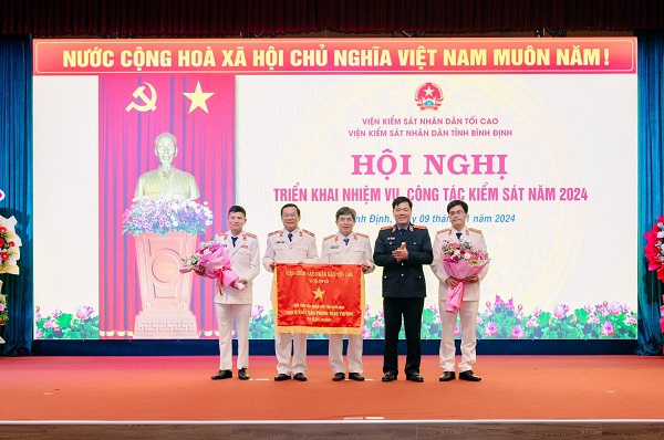 Đ/c Nguyễn Quang Dũng - Phó Viện trưởng Viện KSND tối cao trao tặng Cờ đơn vị xuất sắc phong trào thi đua năm 2023 cho Viện KSND tỉnh Bình Định tại Hội nghị triển khai nhiệm vụ, công tác kiểm sát tổ chức ngày 09/01/2024