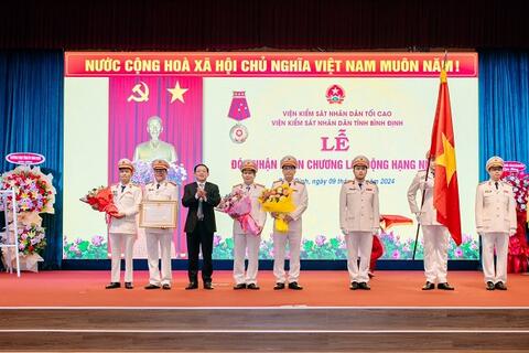 Đ/c Hồ Quốc Dũng - Ủy viên BCH Trung ương Đảng, Bí thư Tỉnh ủy, Chủ tịch HĐND tỉnh thừa ủy nhiệm của Chủ tịch nước trao tặng Huân chương Lao động hạng Nhất cho Viện KSND tỉnh Bình Định tại buổi Lễ đón nhận Huân chương tổ chức ngày 09/01/2024