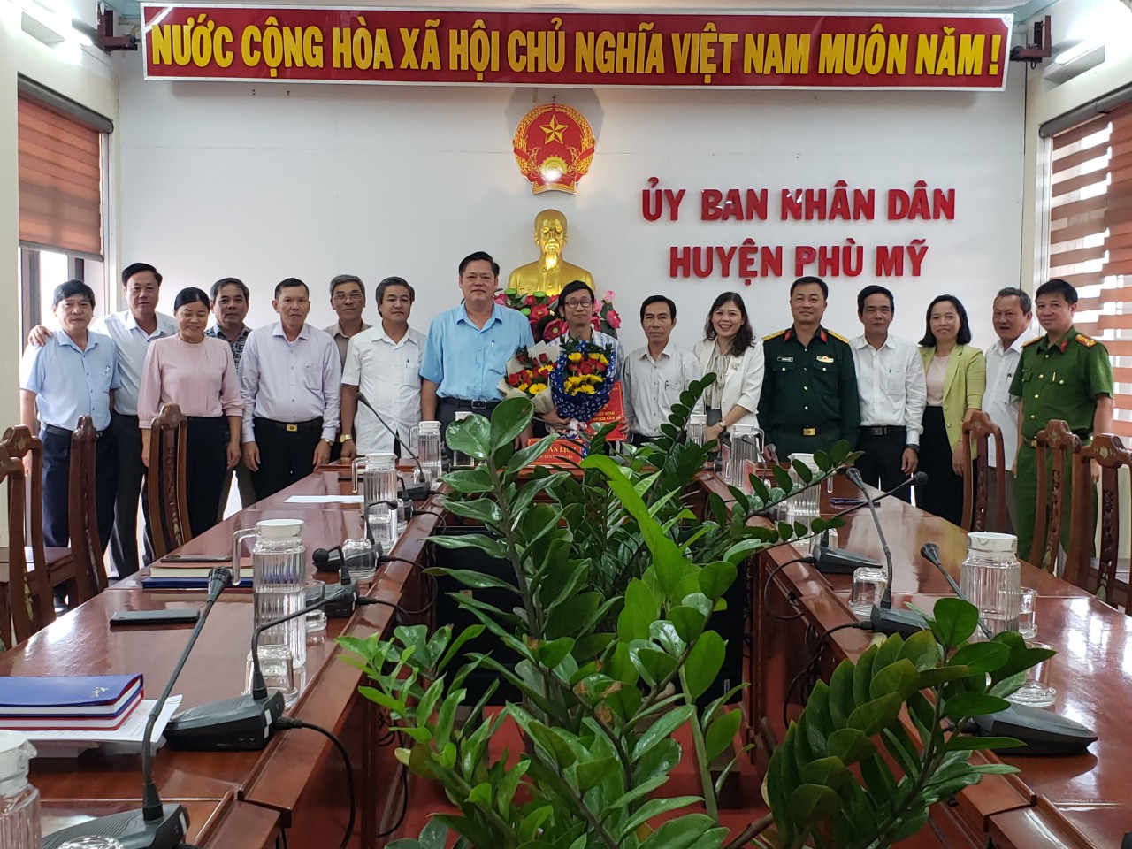 Lãnh đạo huyện tặng hoa và trao quyết định cho đồng chí Đặng Thanh Hoàng