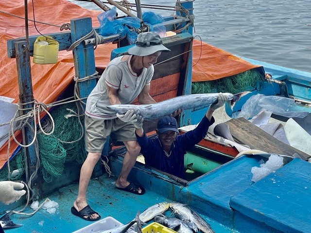 "Chuyến này tàu chúng tôi đánh bắt được các loại như cá cờ, cá bạc má, nhưng nhiều nhất vẫn là các loại cá thu. Hiện giá cá thu đen bán cho thương lái trên 120.000 đồng/kg, cá thu trắng thì giá cao hơn khoảng 180.000-200.000 đồng/kg", anh Phấn nói.
