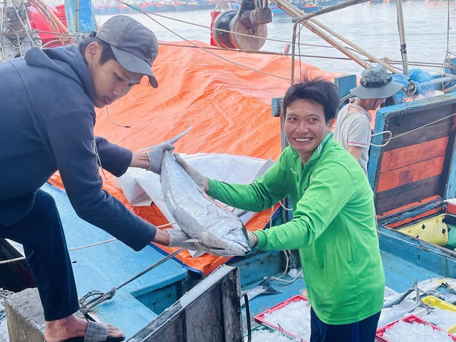 "Năm nay thời tiết đẹp, chuyến này tàu đánh bắt nhiều loại cá, trong đó nhiều nhất là cá ngừ sọc dưa, cá chuồn cồ. Hiện cá ngừ bán cho thương lái là 60.000-70.000 đồng/kg; cá chuồn cồ cũng tương tự. Trừ chi phí, xăng dầu, đá, thực phẩm... chuyến biển cuối năm anh em bạn thuyền được chia mỗi người cũng hơn 17 triệu đồng", ông Lộc phấn khởi cho hay.