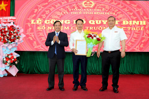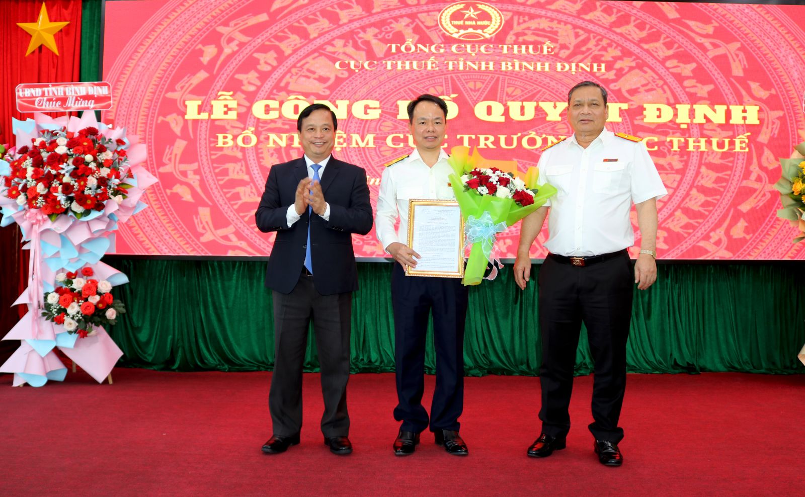 Ông Nguyễn Anh Tuấn (giữa) nhận quyết định bổ nhiệm chức vụ Cục trưởng Cục Thuế tỉnh Bình Định.