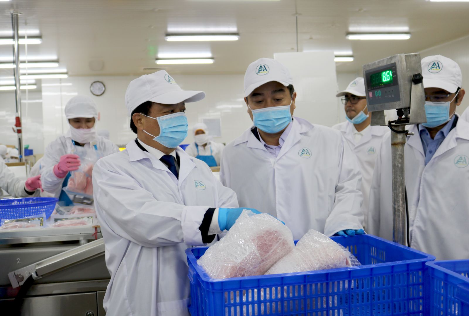 Phó Chủ tịch Thường trực UBND tỉnh Nguyễn Tuấn Thanh (ngoài cùng bên trái) kiểm tra hoạt động chế biến thủy sản tại Công ty TNHH Thủy sản An Hải.