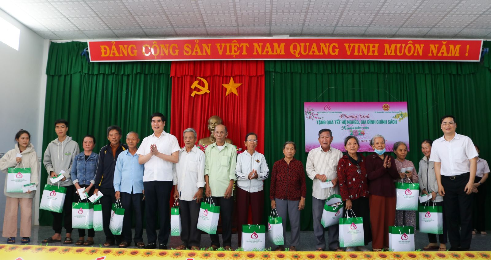 Phó Chủ tịch UBND tỉnh Lâm Hải Giang (thứ 6 từ trái qua) tặng quà cho các gia đình chính sách tiêu biểu, hộ nghèo, cận nghèo và hộ có hoàn cảnh khó khăn ở huyện Phù Cát.
