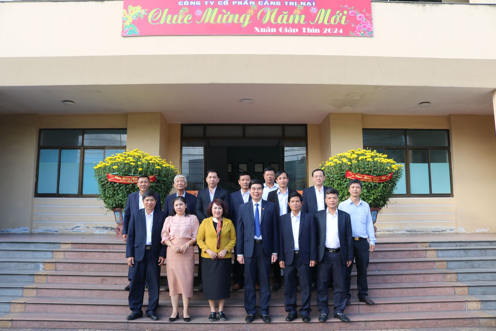 Phó Chủ tịch UBND tỉnh Lâm Hải Giang chụp ảnh lưu niệm cùng cán bộ, công nhân viên Công ty cổ phần Cảng Thị Nại.