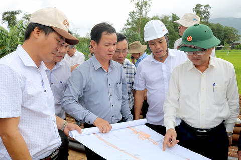 Phó Chủ tịch UBND tỉnh Nguyễn Tự Công Hoàng (bìa phải) kiểm tra tiến độ dự án Tuyến đường nối từ Quốc lộ 19 đến Khu Công nghiệp Becamex – VSIP kết nối đến cảng Quy Nhơn.