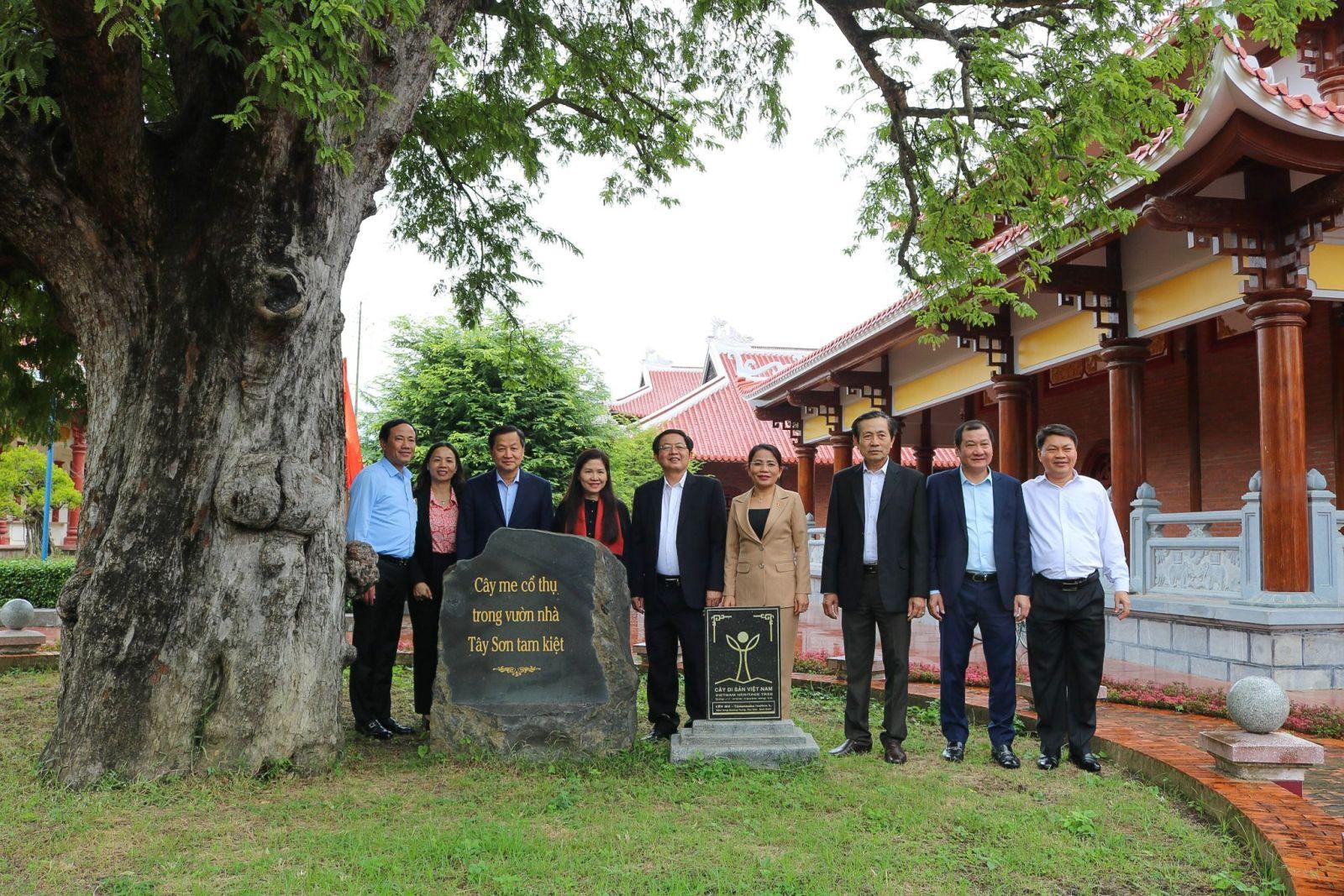 Đoàn công tác và lãnh đạo tỉnh chụp ảnh lưu niệm tại cây me cổ thụ trong khuôn viên Bảo tàng Quang Trung.