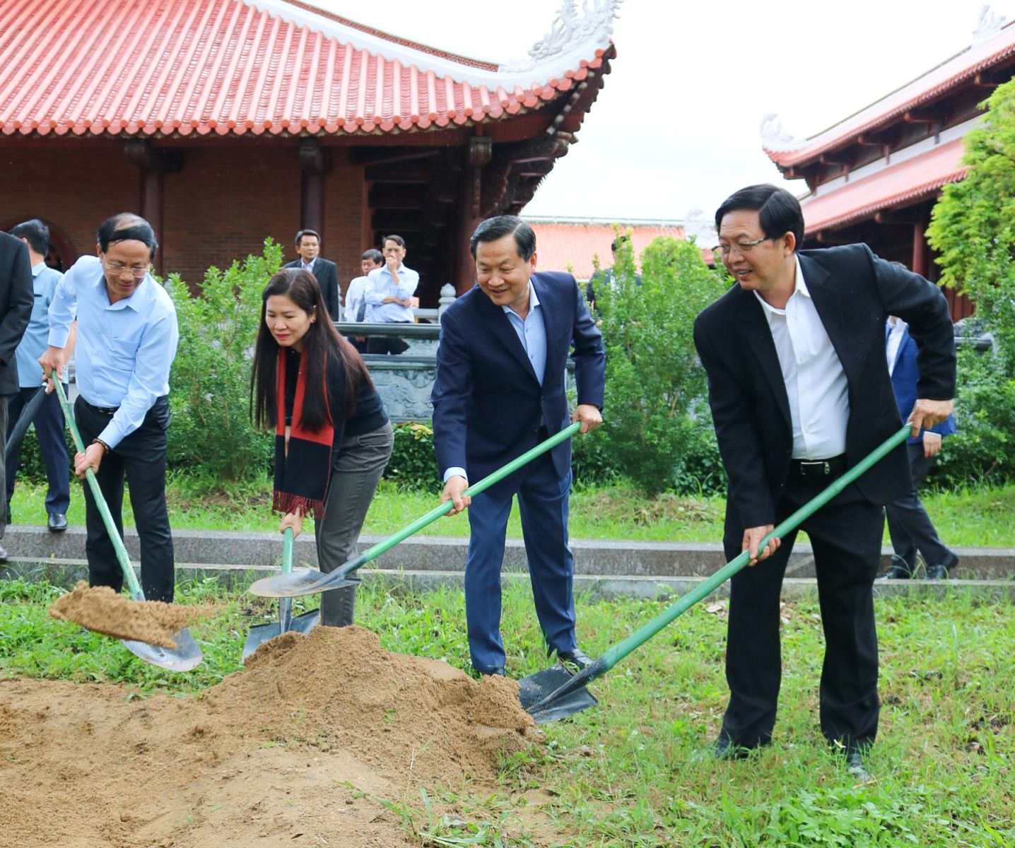 Phó Thủ tướng Chính phủ Lê Minh Khái cùng đoàn công tác và lãnh đạo tỉnh trồng và tưới cây lưu niệm tại Bảo tàng Quang Trung.