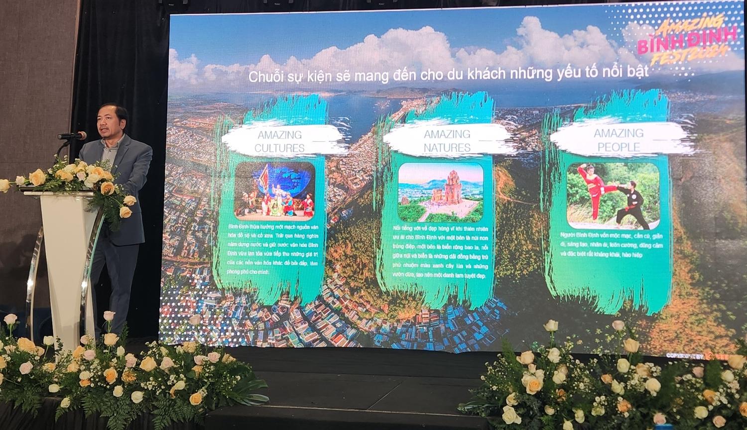 Ông Đặng Thành Hưng - Giám đốc Trung tâm Xúc tiến Du lịch Bình Định giới thiệu các sự kiện, lễ hội du lịch Bình Định năm 2024, Ảnh: Lê Trân - TTXTDL Bình Định.