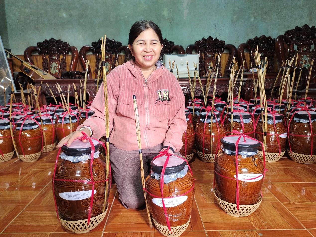 Là một trong những người có công “giữ lửa” cho rượu cần truyền thống, chị Đinh Thị Co, ở thôn 1, xã An Hưng đang cùng các thành viên trong gia đình chuẩn bị gần 300 ché rượu cần để kịp cung cấp trong dịp tết Nguyên đán này.
