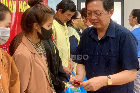 Bí thư Tỉnh ủy Hồ Quốc Dũng - Chủ tịch danh dự Hội Bảo trợ bệnh nhân nghèo tỉnh tặng quà cho bệnh nhân nghèo tại BVĐK tỉnh. Ảnh: TRẦN ĐÌNH KÝ