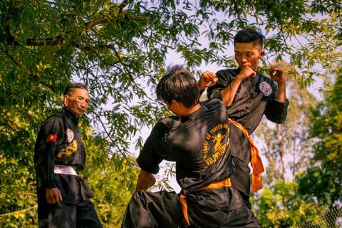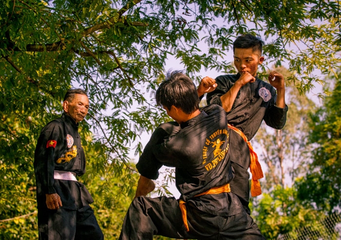 Đại võ sư quốc tế Phi Long Vinh truyền thụ võ cổ truyền cho môn đệ tại võ đường mang tên ông ở Phước Sơn, Tuy Phước, Bình Định.