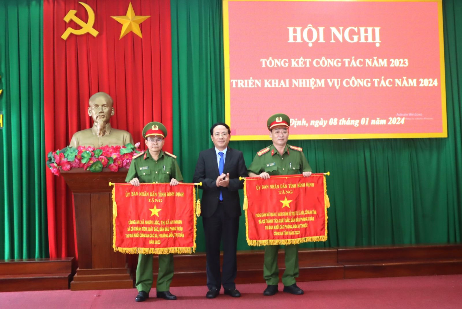 Chủ tịch UBND tỉnh Phạm Anh Tuấn (giữa) tặng Cờ thi đua của UBND tỉnh cho 2 tập thể: Phòng Cảnh sát Quản lý hành chính về trật tự xã hội, Công an tỉnh và Công an xã Nhơn Lộc, thị xã An Nhơn, đã có thành tích xuất sắc, dẫn đầu phong trào thi đua năm 2023.