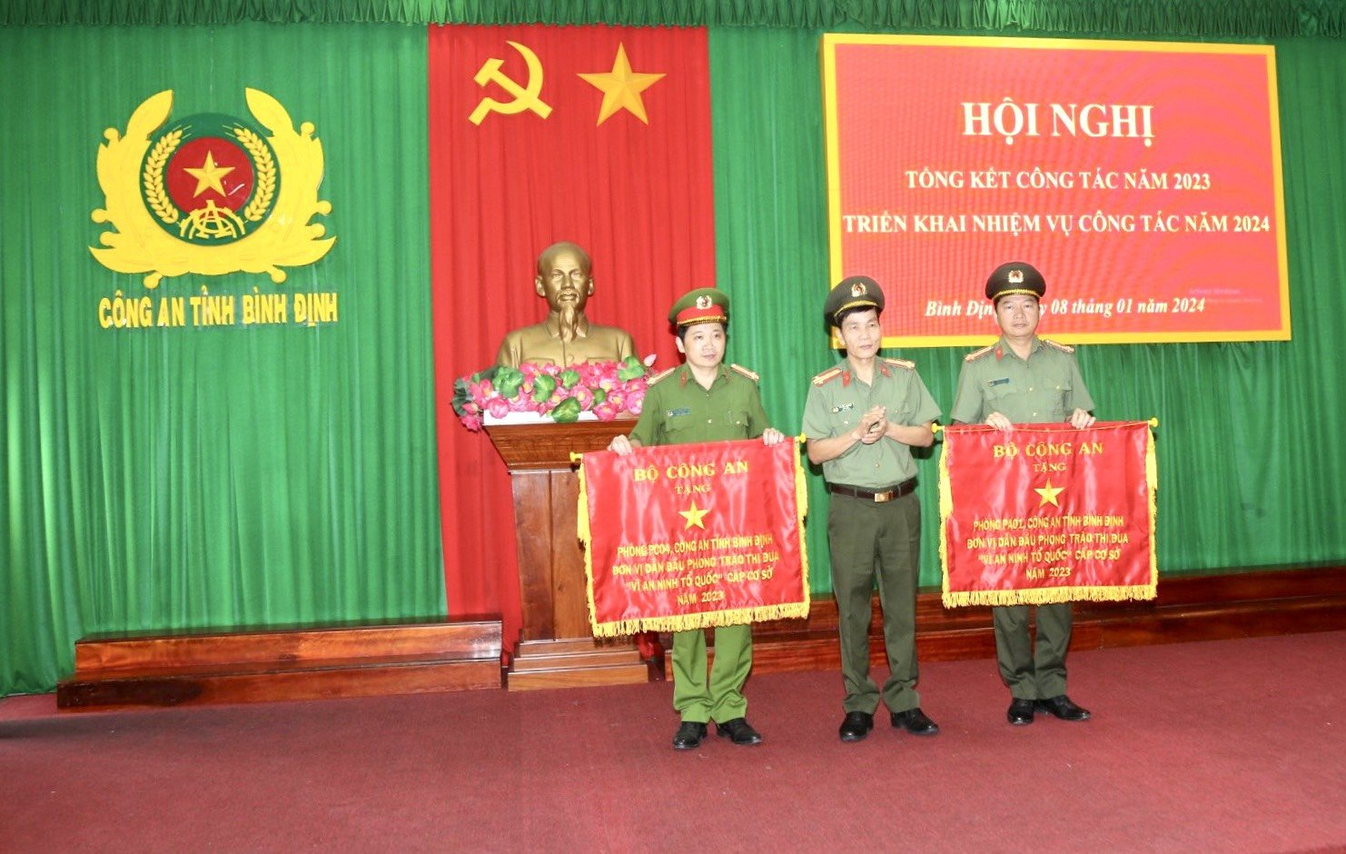 Dịp này, Đại tá Võ Đức Nguyện - Giám đốc Công an tỉnh thừa uỷ quyền của Bộ trưởng Bộ Công an trao Cờ thi đua của Bộ Công an cho 02 tập thể; trao danh hiệu Đơn vị Quyết thắng cho 07 tập thể đã có thành tích xuất sắc trong phong trào thi đua Vì ANTQ năm 2023 và 26 tập thể đạt danh hiệu đơn vị văn hoá, gương mẫu chấp hành điều lệnh CAND năm 2023.