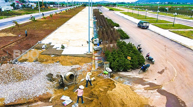 Đẩy nhanh tiến độ xây dựng hạ tầng khu trưng bày giới thiệu sản phẩm mai vàng ở thôn Trung Định, xã Nhơn An để tổ chức Triển lãm. Ảnh: NGỌC NHUẬN