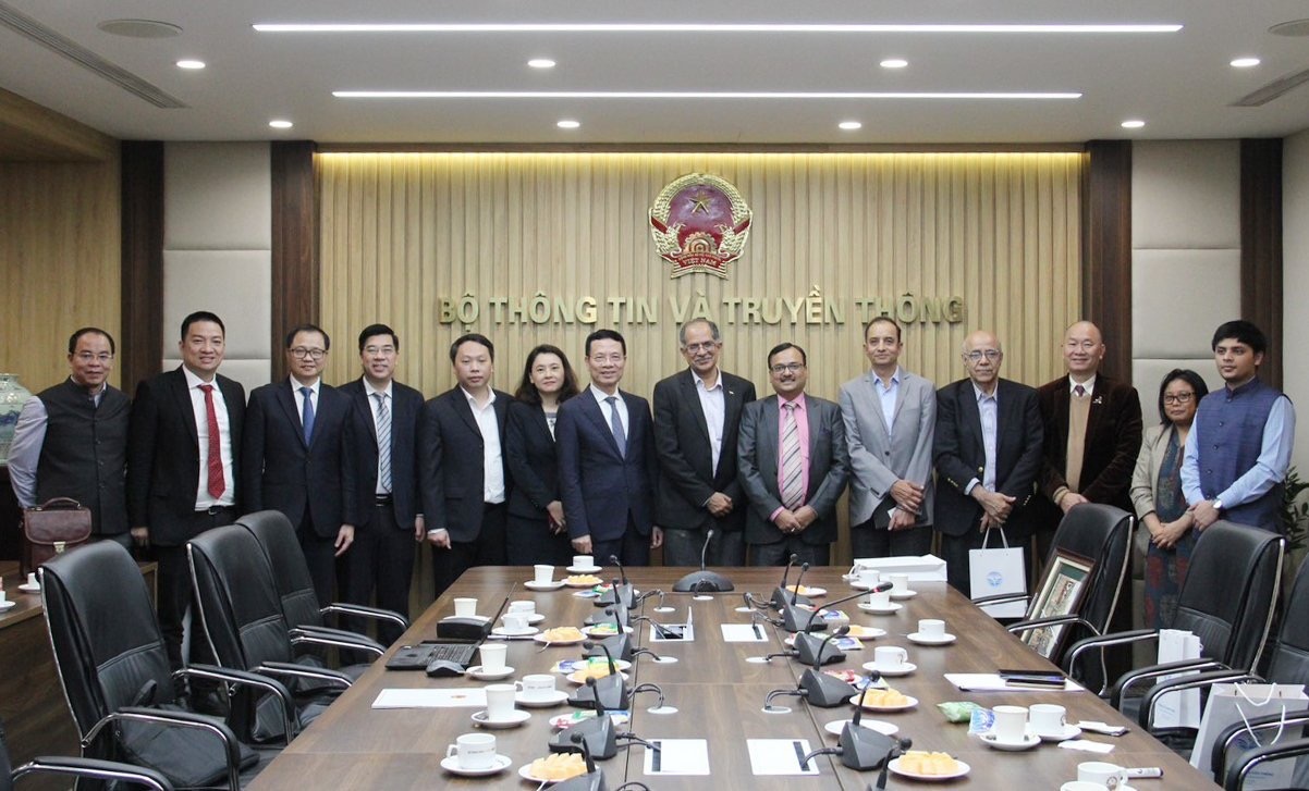 Bộ trưởng Nguyễn Mạnh Hùng và Thứ trưởng Nguyễn Huy Dũng chụp ảnh lưu niệm với Lãnh đạo tổ chức iSPIRT của Ấn Độ, kiêm thành viên Ban tư vấn về trí tuệ nhân tạo của Liên hợp quốc