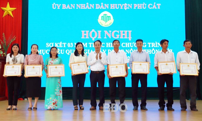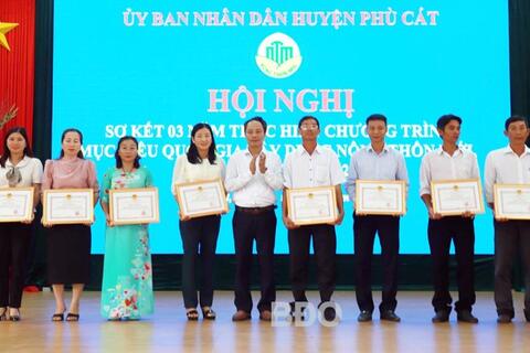 Dịp này, UBND huyện Phù Cát khen thưởng 8 tập thể, 14 cá nhân có thành tích tiêu biểu trong phong trào xây dựng NTM của huyện
